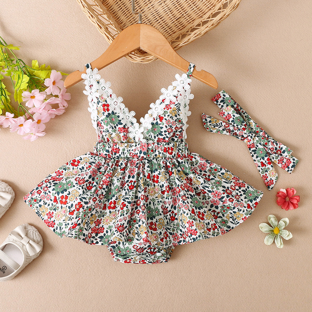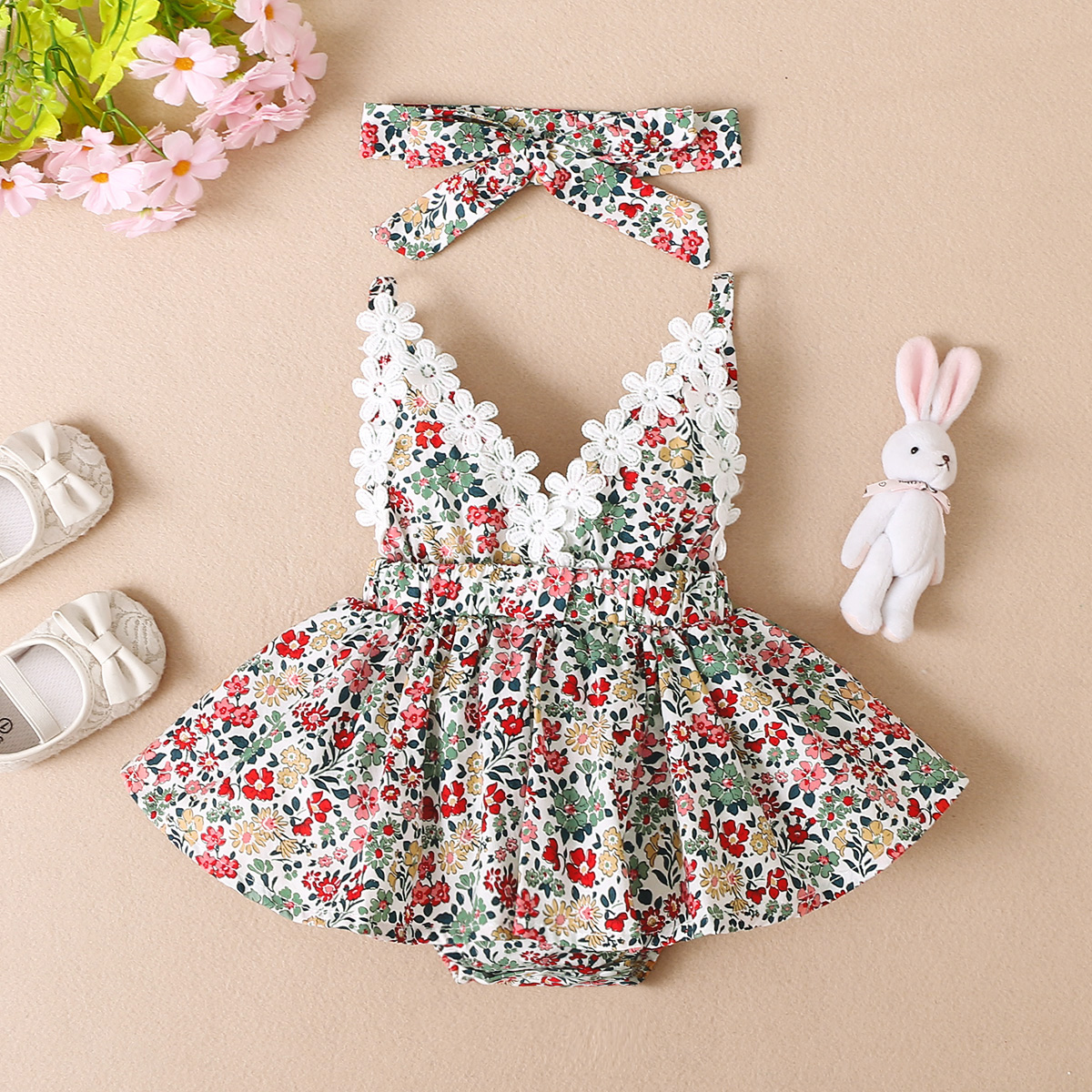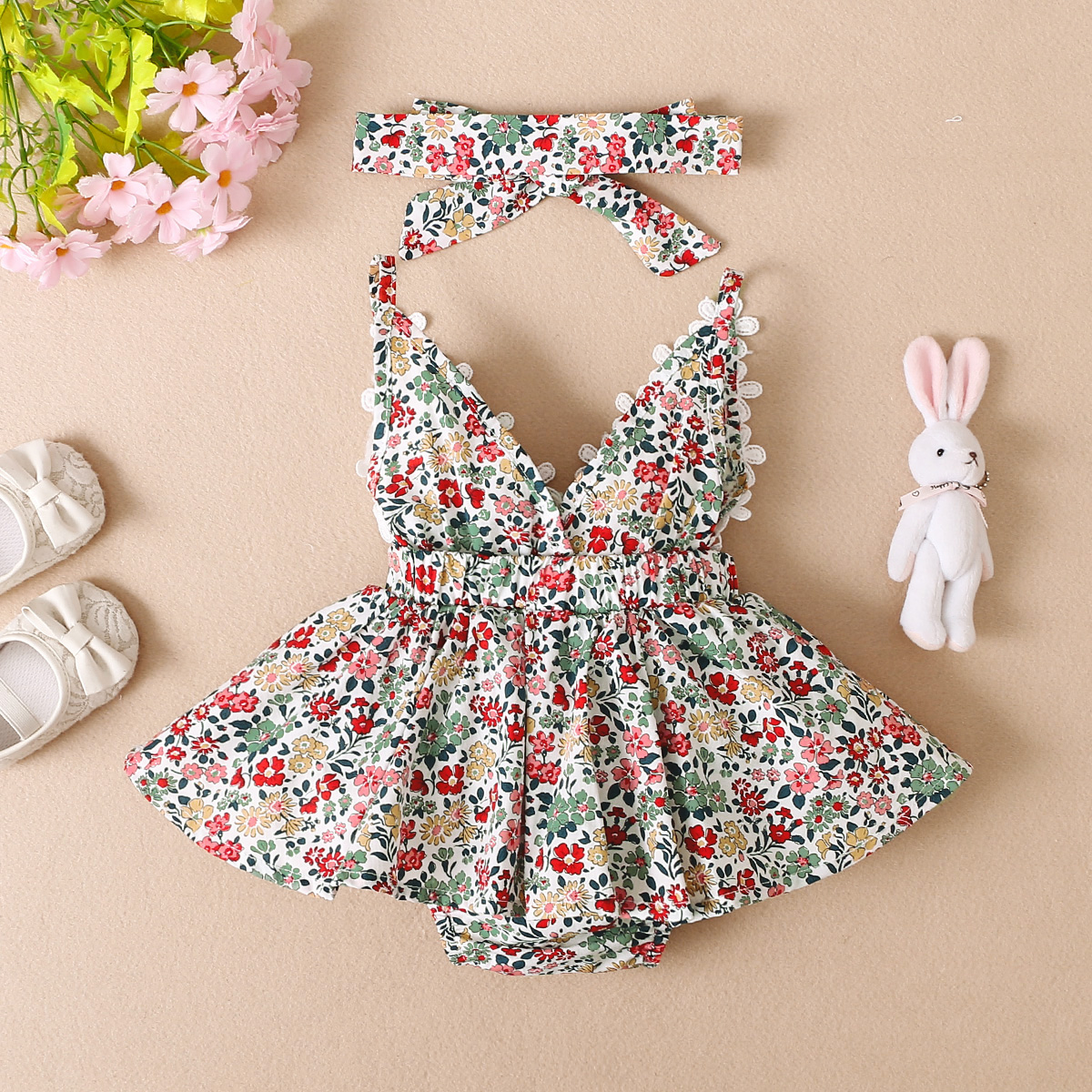 hibobi Girl Baby V-neck Floral Halter Dress Bodysuit & Headband Wholesale