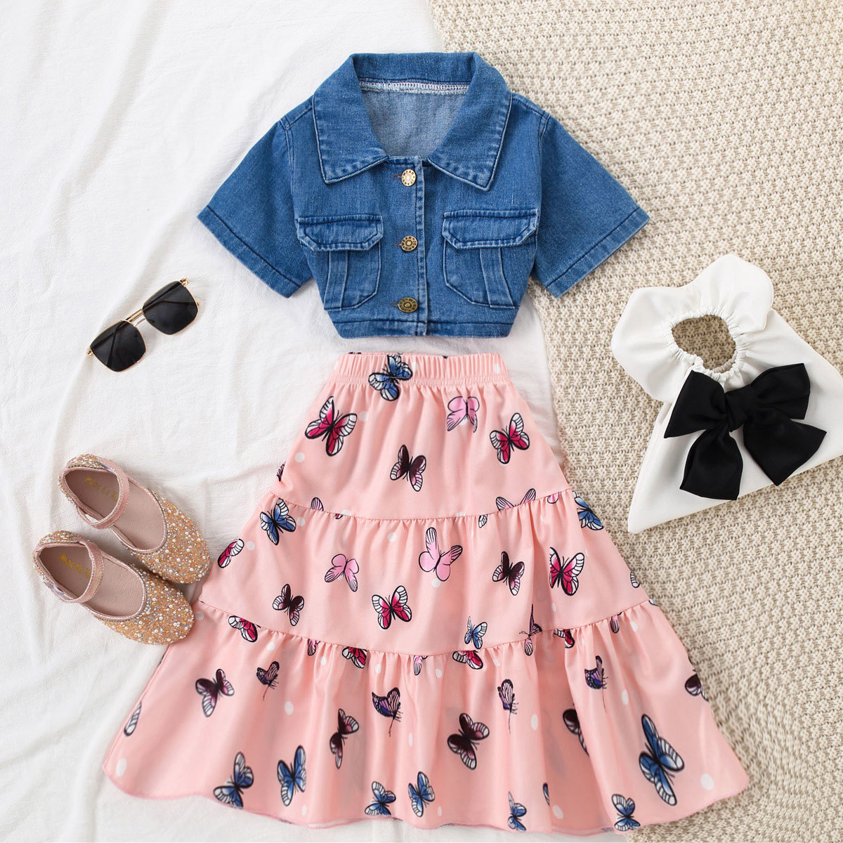 Kid Girl Butterfly Print Denim Top & Skirt Wholesale