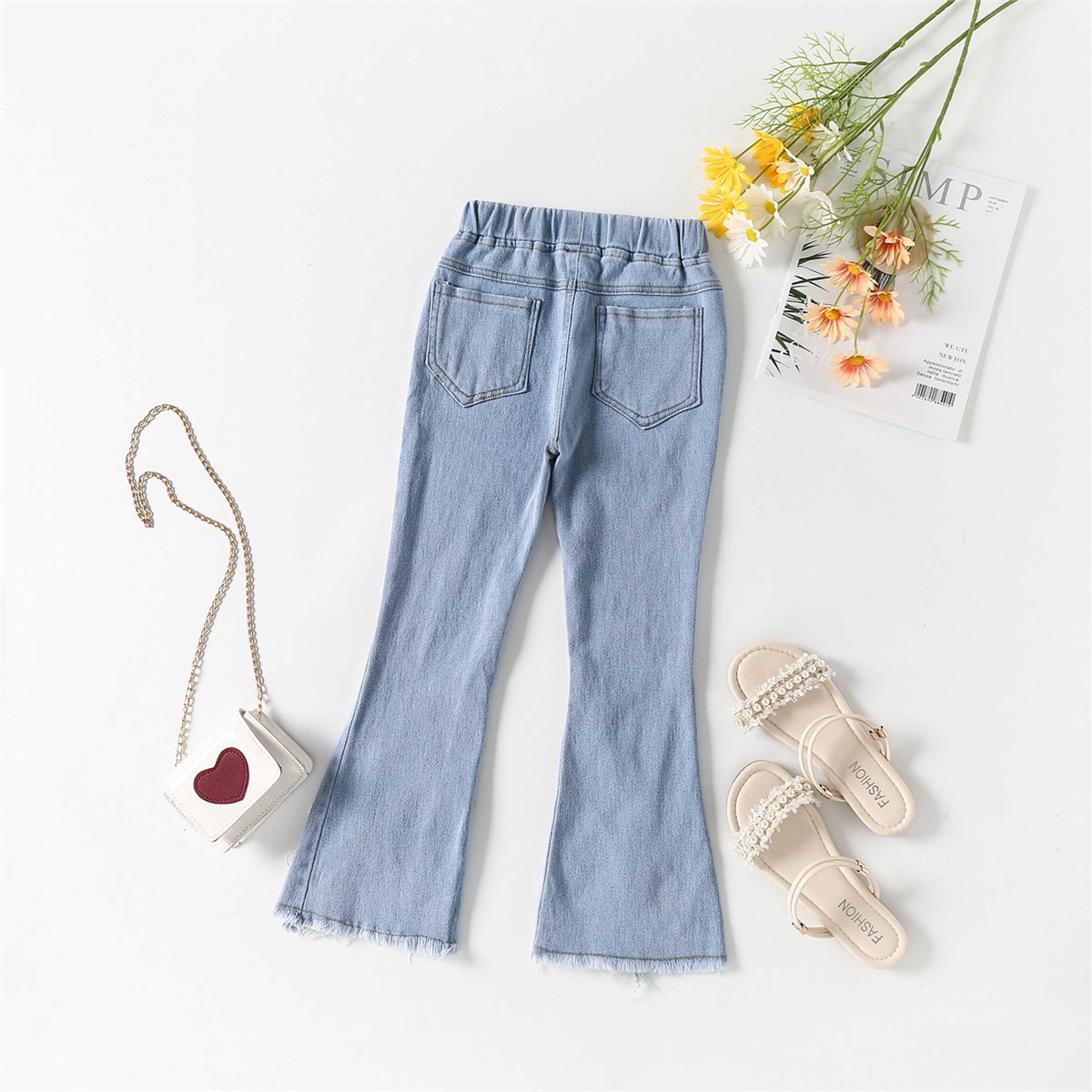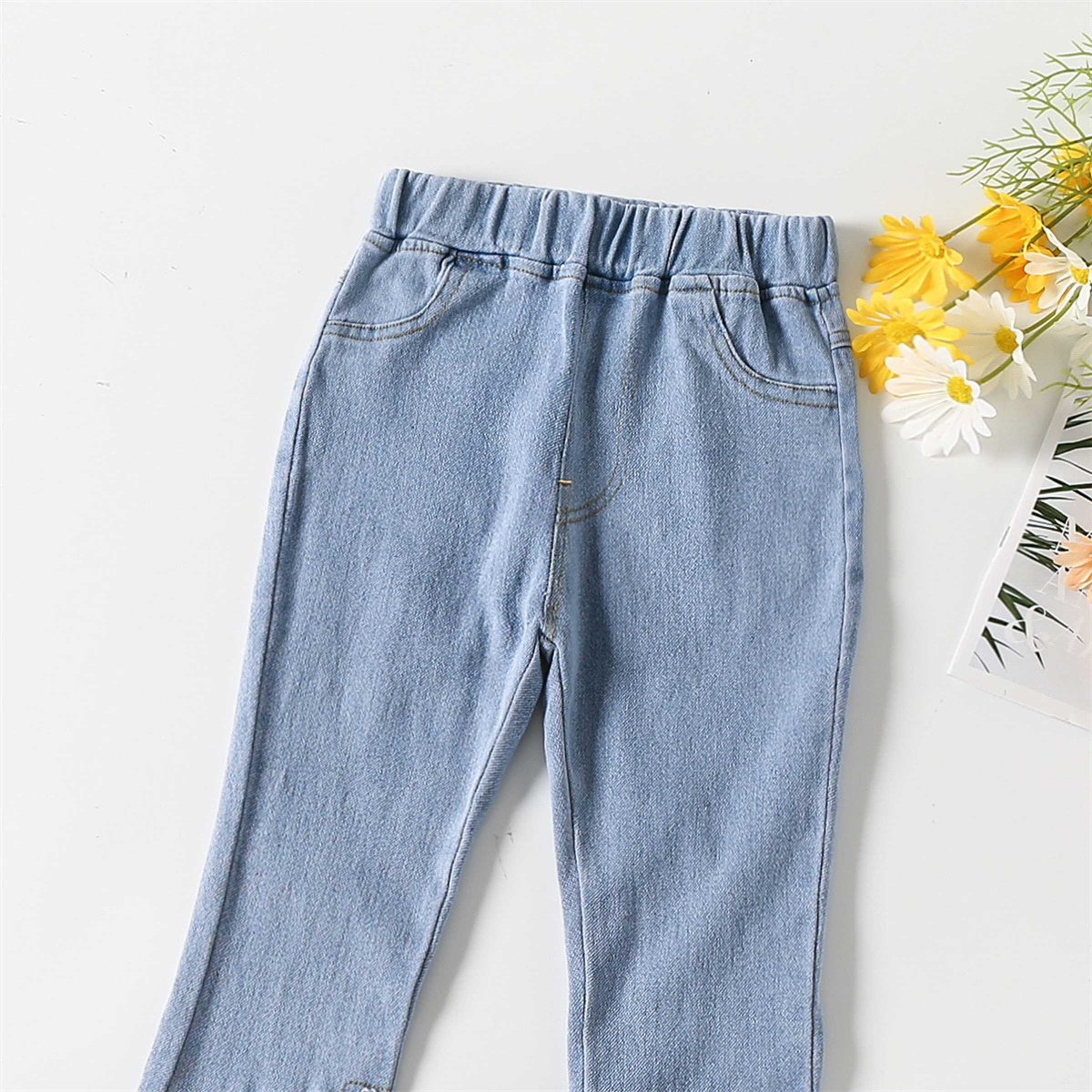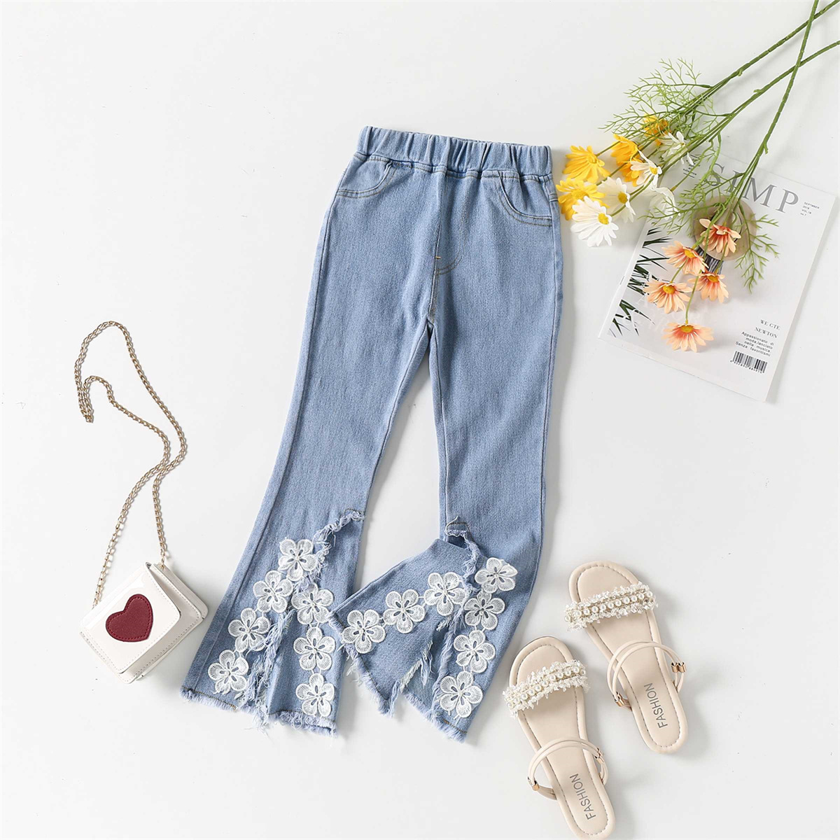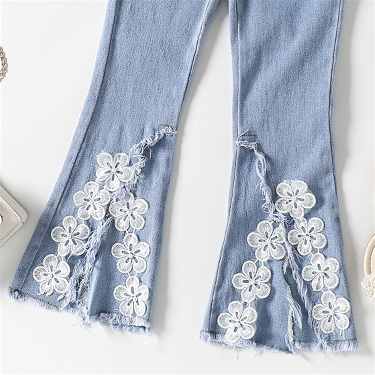 Kids Girls Sweet Lace Flowers Tassels Slit Denim Flare Pants Wholesale