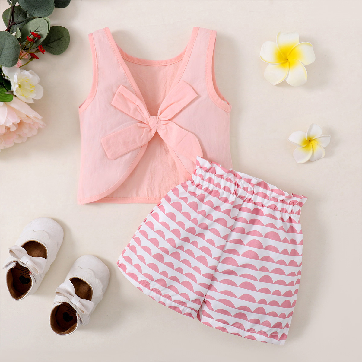 Toddler Girl Casual Bow Knot Decor Geometric Tank Top & Shorts Wholesale